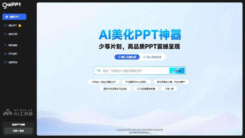 GAIPPT是AI智能美化PPT神器,支持上传PPT一键美化,AI会自动分析内容结构,自动适配最合适的版式,达到PPT排版美化效果。通过AI技术帮助用户优化PowerPoint演示文稿的设计和布局。只需输入内容,GAIPPT能自动进行设计和排版,快速生成专业外观的幻灯片。GAIPPT提供行业母版、一键换肤、智能排版等功能,简化了PPT制作过程中的操作步骤,提高了工作效率。